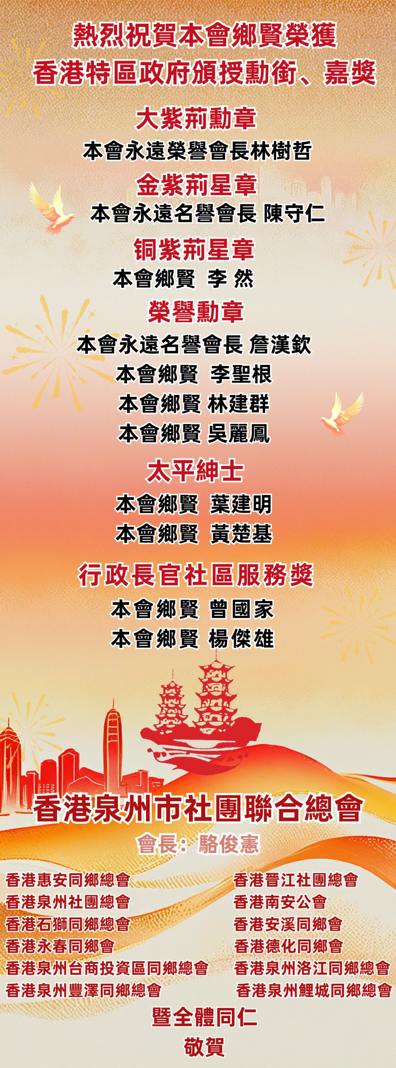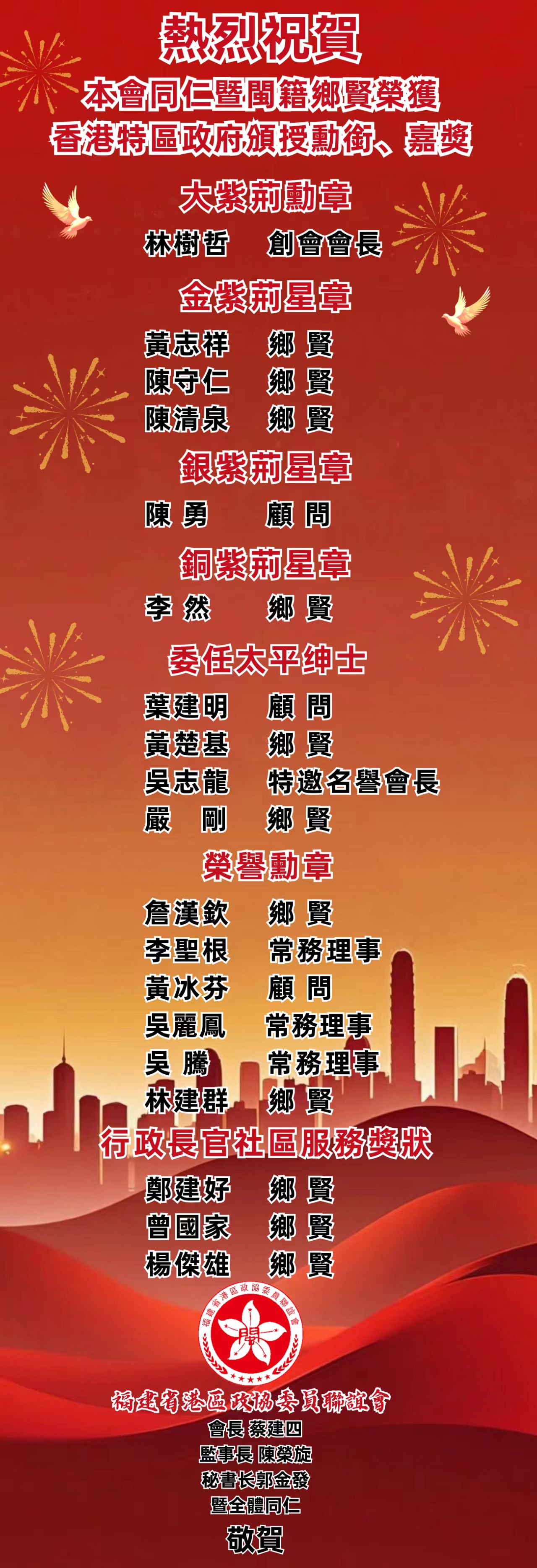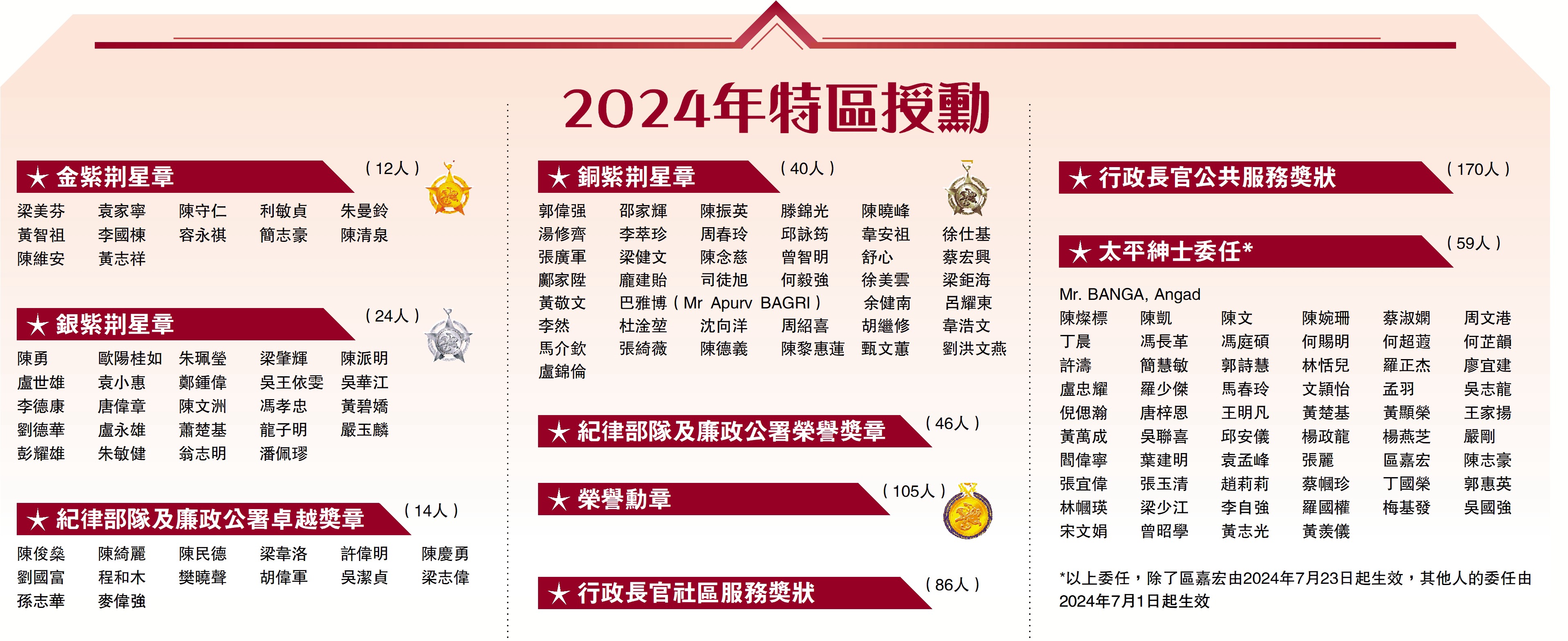 2024年7月1日,在香港回歸祖國27周年之際,香港特別行政區(qū)政府在憲報(bào)刊登2024年授勛及委任太平紳士名單,共502人獲行政長官頒授勛銜及作出嘉獎(jiǎng)。
