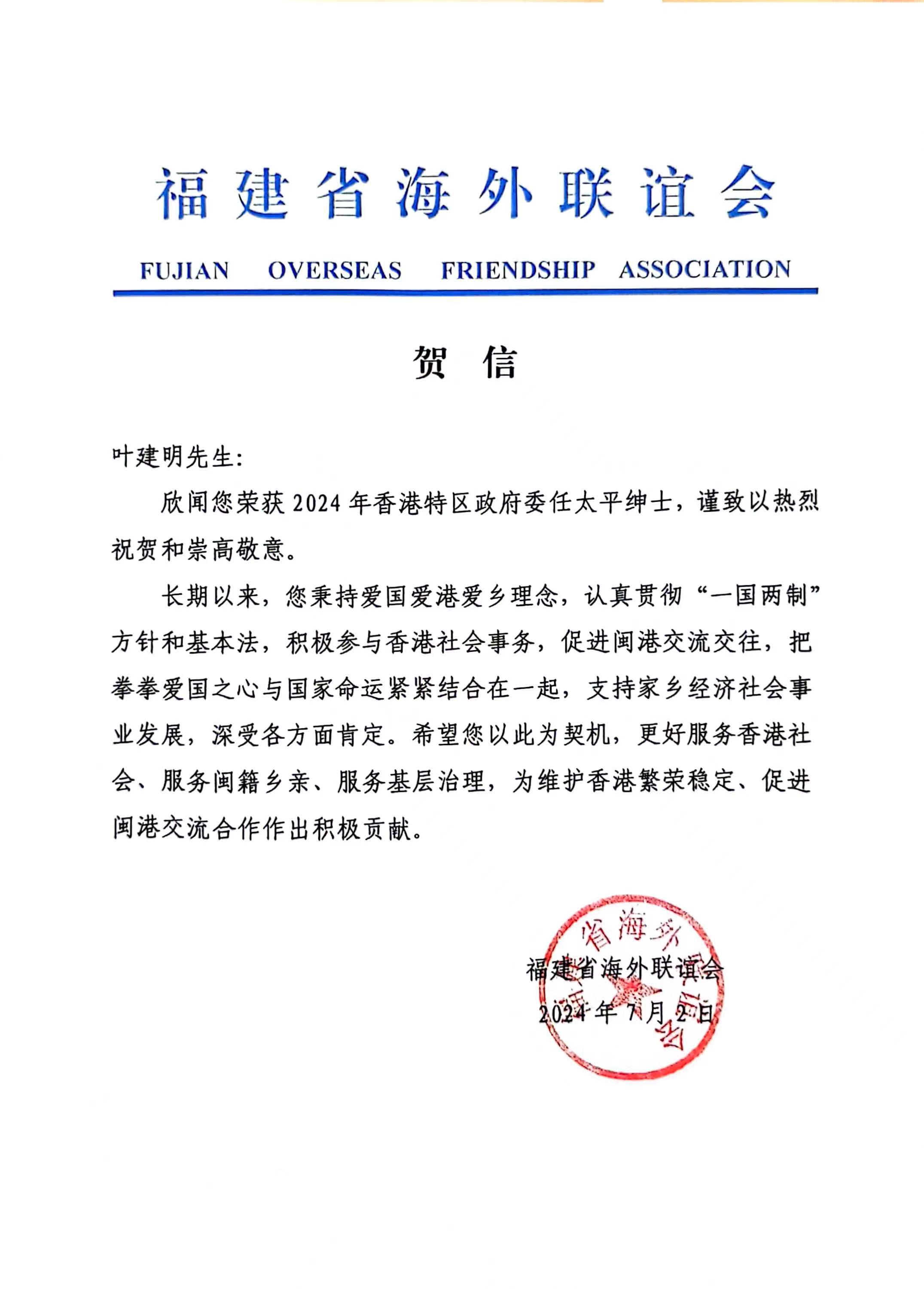 葉建明先生,十三屆、十四屆全國政協(xié)委員,香港福建社團(tuán)聯(lián)會(huì)副主席、香港樂群慈善基金會(huì)常務(wù)副主席、香港福建希望工程基金會(huì)榮譽(yù)主席、香港福建同鄉(xiāng)會(huì)副會(huì)長、香港島各界聯(lián)合會(huì)第十屆常務(wù)副理事長及第四屆常務(wù)董事、香港泉州同鄉(xiāng)會(huì)會(huì)長、香港手套業(yè)商會(huì)有限公司名譽(yù)會(huì)長、福建省省慈善總會(huì)特約顧問、鯉城區(qū)工商聯(lián)(總商會(huì))永遠(yuǎn)榮譽(yù)會(huì)長等職務(wù),2022年香港“榮譽(yù)勛章”獲得者,嘉鴻集團(tuán)在2024年也被泉州市人民政府授予“泉州慈善企業(yè)(機(jī)構(gòu))”稱號(hào)。