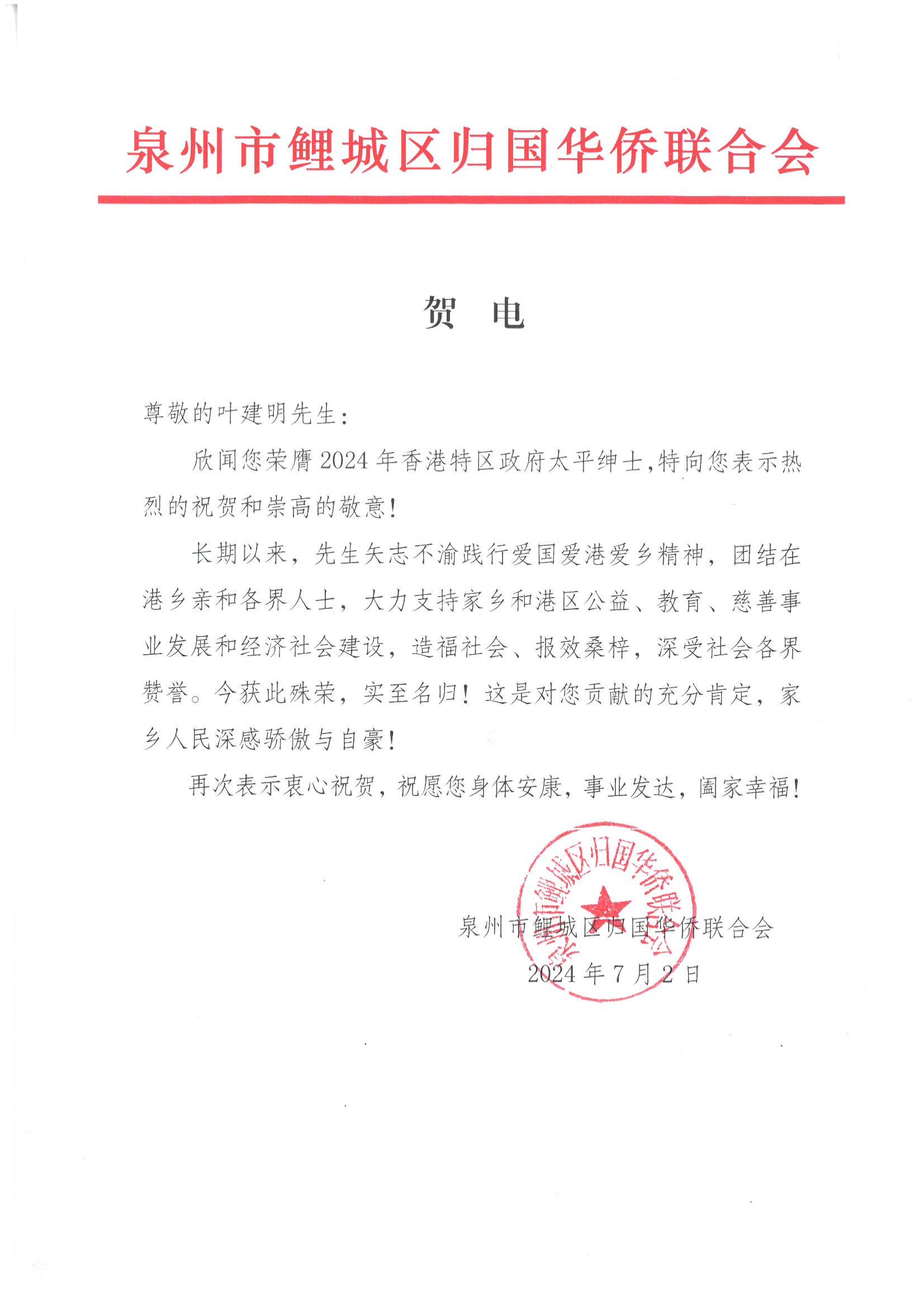 泉州市鯉城區(qū)歸國華僑聯(lián)合會(huì)賀電 福建省海外聯(lián)誼會(huì)賀信