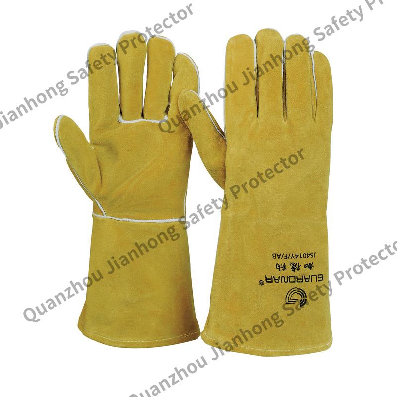Thermal insulation welder protective gloves, gardenia shaped thumb, cow leather to strengthen the palm surface, lengthen the cuff length by 14cm, which can effectively protect against mechanical risks, fire and fire, heat conduction and contact heat, and prevent droplets from melting and metal sputtering.